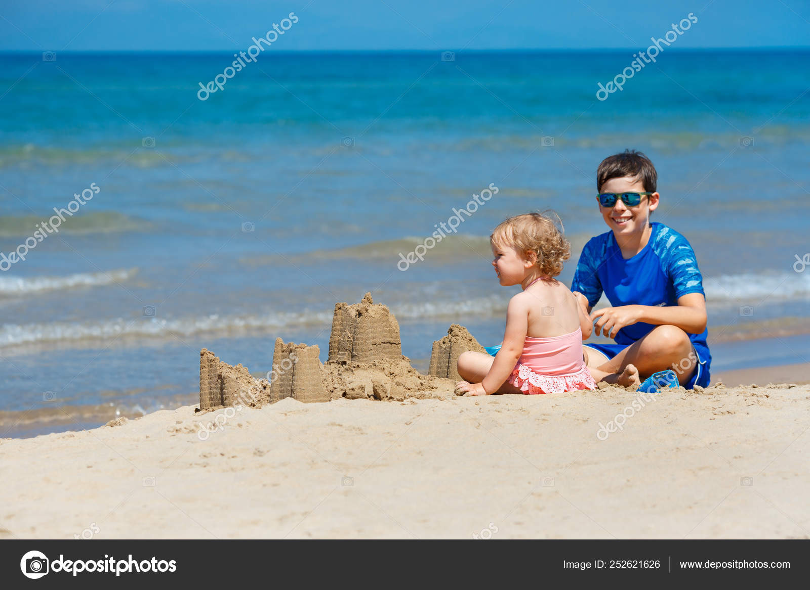 Deti Igrayut Na Plyazhe Dvoe Detej Stroyat Peschanyj Zamok Na Beregu Morya Semejnyj Otdyh Na Tropicheskom Kurorte Puteshestvie S Malenkim Rebenkom Stokovoe Foto C Levranii 252621626