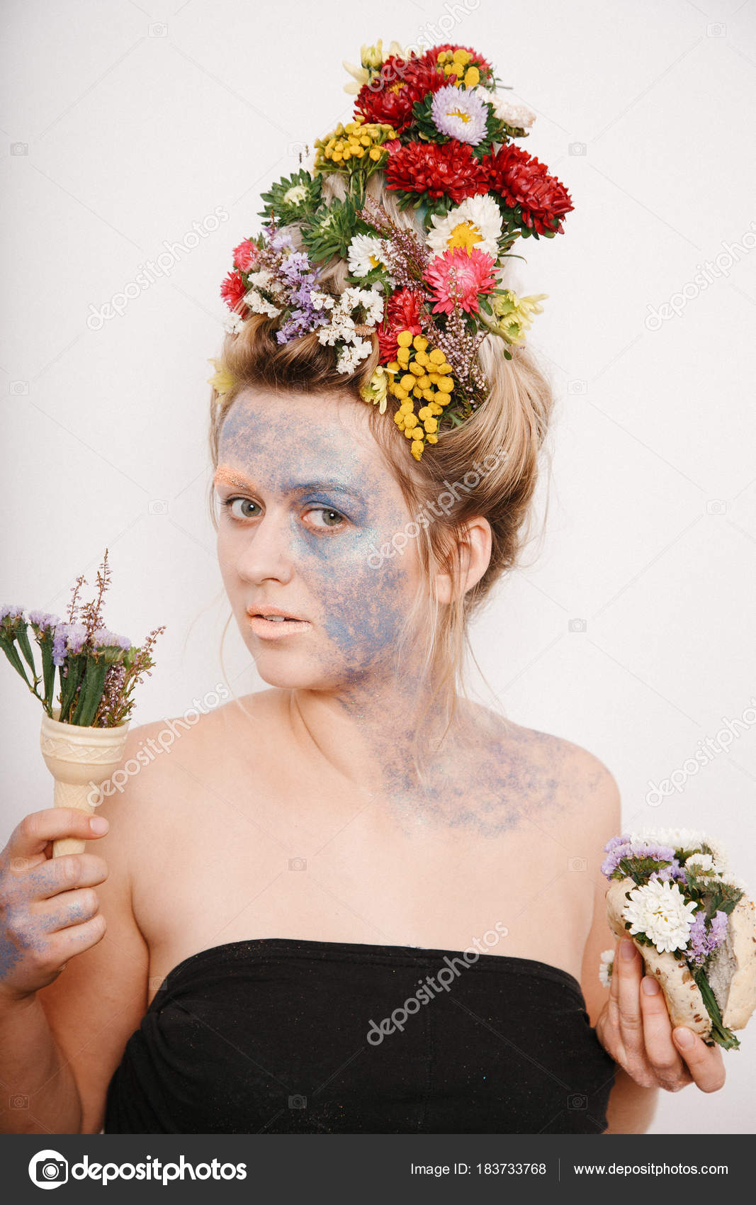 Molodaya Zhenshina S Cvetami Na Golove I Rukah Vesennee Izobrazhenie S Cvetami Devushka S Cvetushimi Volosami I Parchoj Na Lice Stokovoe Foto C Bilyk I 183733768