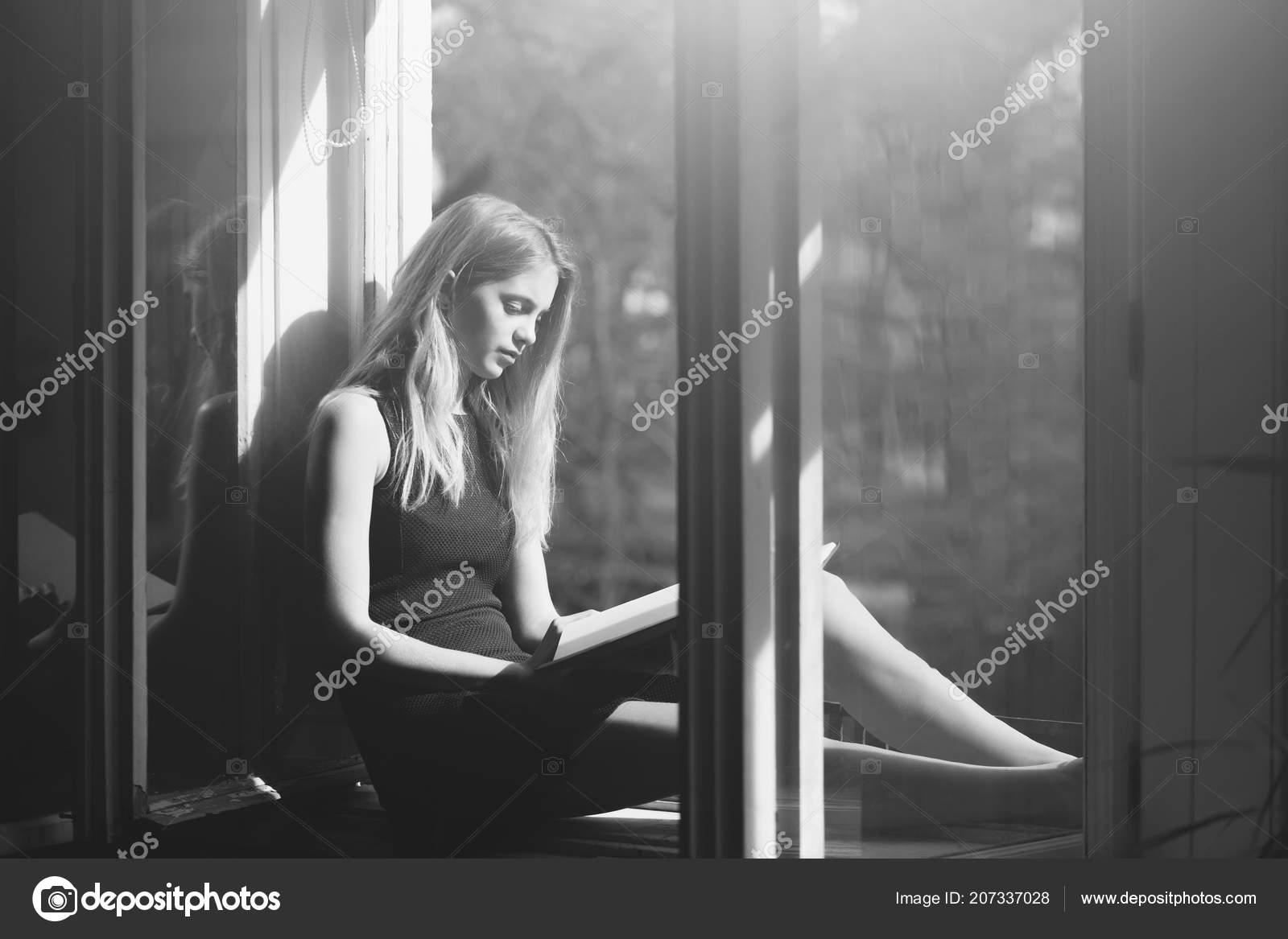 Krasivaya Devushka Chitaet Knigu Na Podokonnike Stokovoe Foto Izobrazhenie Naschityvayushej Okno Volosy 156492188